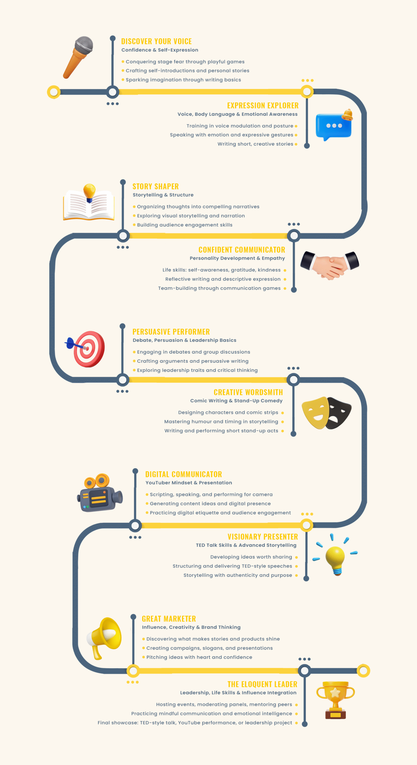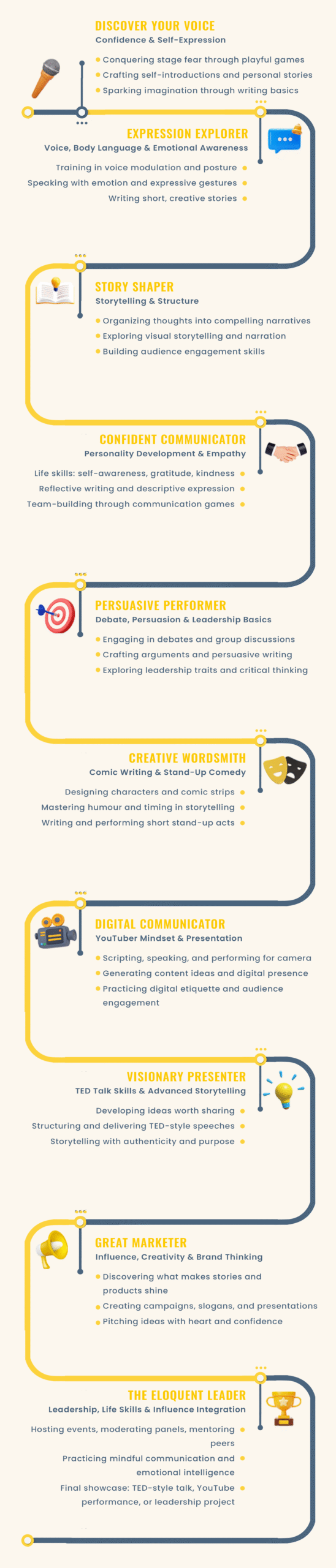 At Eloquent Kids, we unlock every child’s potential through a transformative 10-level journey that blends public speaking, emotional intelligence, leadership, creative writing, life skills, and digital influence.